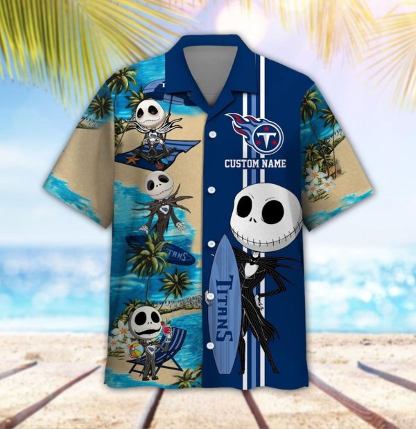 Tennessee Titans Jack Skellington Custom Name Short Sleeve Button Up Tropical Aloha Hawaiian Shirts